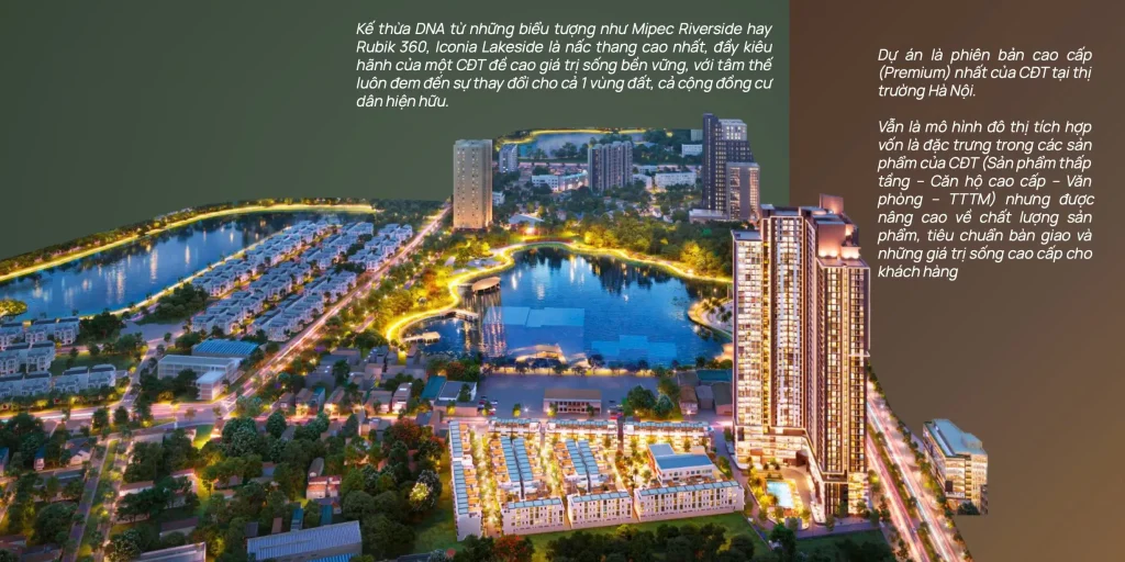 Kế thừa những DNA biểu tượng của Mipec như Mipec Riverside, Mipec Rubik360, Iconia Lakeside là phiên bản cao cấp (premium) nhất của chủ đầu tư Mipec tại thị trường Hà Nội.